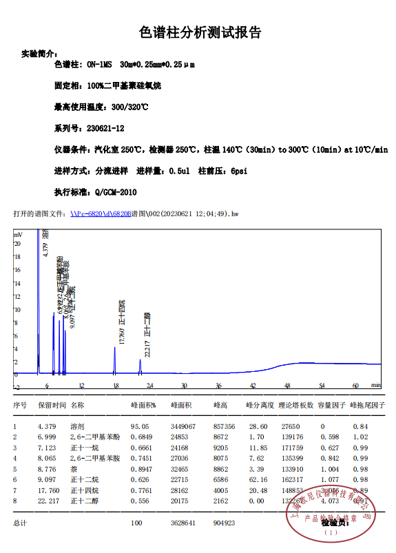 ON-1MS毛细管色谱柱是由高纯100%聚甲基硅氧烷键合交联制成,特殊的键合交联处理使得ON-1MS毛细管色谱柱具有良好的惰性,柱流失极低,主要用于色质联用分析。